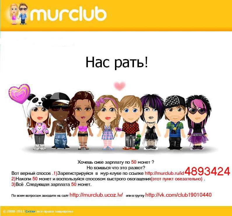 Зарегистрировавшись по http://murclub.ru/id4893424 ссылке вы станете приглашенным пользователем, и будете получать повышенную зарплату — 10 монет вместо обычных 8, поэтому выгодно быть именно приглашенным в Мур-Клуб, а не просто так прийти в него с улицы. А если вы используйте любой способ быстрого обогащения ,то ваша зарплата станет по 100 монет , и так далие ! Удачи